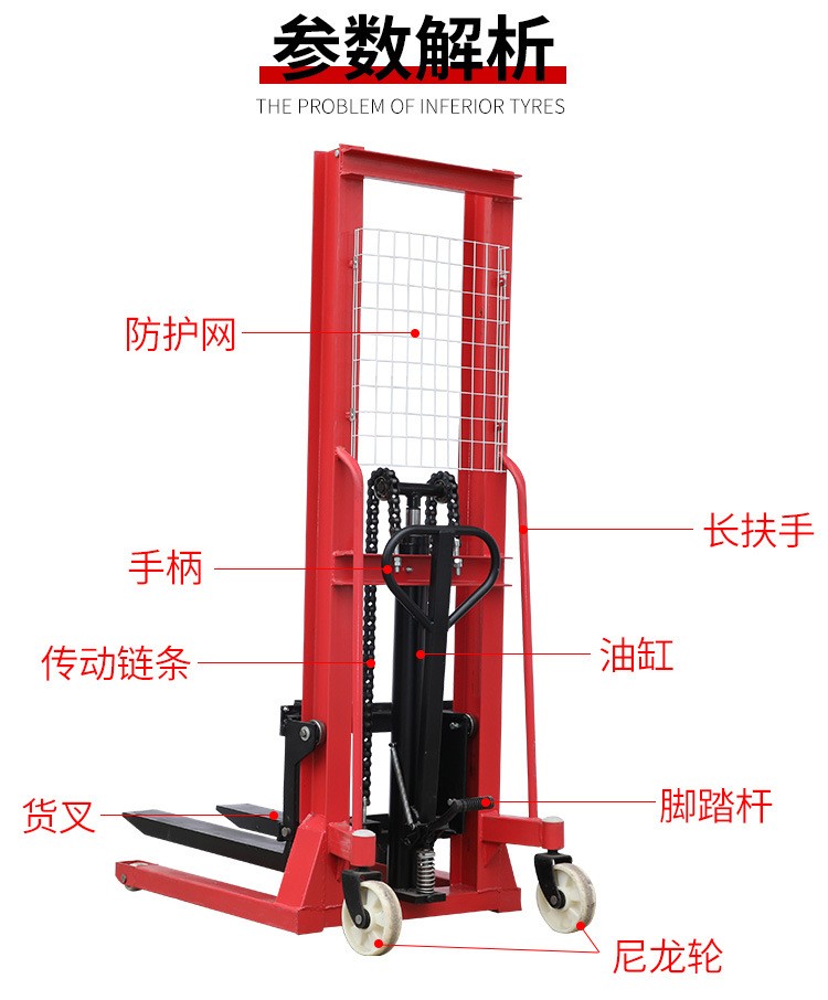 產品名稱:液壓堆高車1.5T1.6M; 行業分類:交通運輸>運輸搬運設備>堆高車>液壓堆高車>手動堆高車; 細節特點: 采用低噪音尼龍輪,適用于多種場地,帶剎車制動。